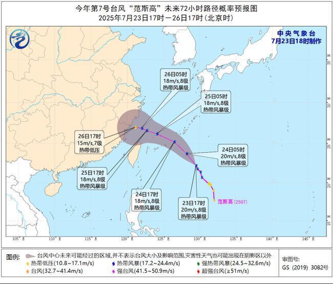 預計,“範斯高”將以每小時15~20公里的速度向西北方向移動,將於24日傍晚移入東海南部海面,並向浙江南部到福建北部一帶沿海靠近,強度逐漸減弱。