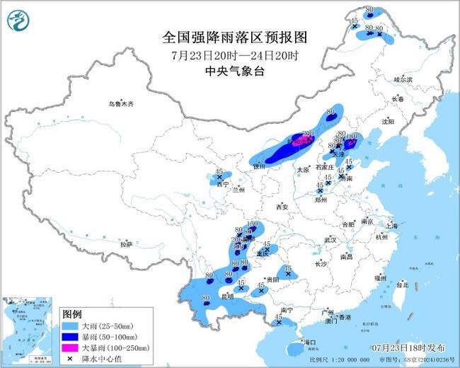 預計,7月23日20時至24日20時,內蒙古東北部和中西部偏南地區、寧夏北部、陝西北部、山西北部、河北中東部和西北部、天津、北京中東部、河南東北部、山東西北部、四川盆地西部、重慶南部、貴州東部和南部、雲南中北部、廣西西部和南部、海南島以及青海東北部、黑龍江西北部等地部分地區有大到暴雨,其中,內蒙古中西部偏南地區、河北東北部、四川盆地西部等地局地有大暴雨(100~200毫米)。上述部分地區伴有短時強降水(最大小時降雨量20~50毫米,局地可超過70毫米),局地有雷暴大風等強對流天氣。