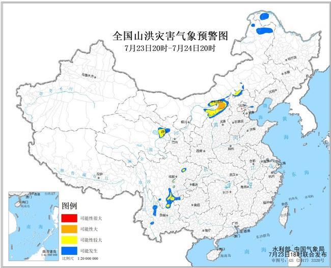 預計,7月23日20時至24日20時,山西北部、內蒙古中部、青海東部、四川中東部、雲南北部、陝西北部等地部分地區發生山洪災害可能性較大(黃色預警),其中,山西北部、內蒙古中部等地局地發生山洪災害可能性大(橙色預警)。其他地區也可能因局地短歷時強降水引發山洪災害,請各地注意做好即時監測、防汛預警和轉移避險等防範工作。