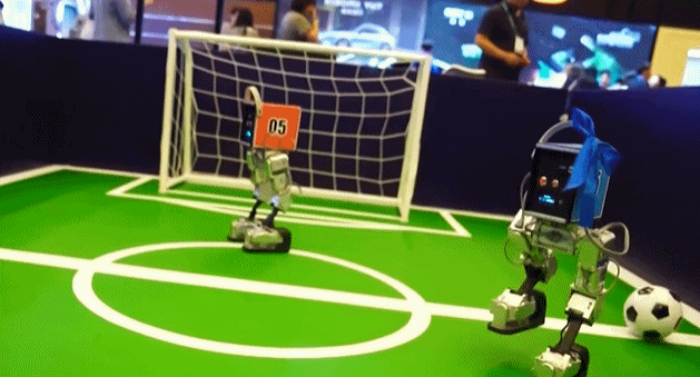 幾個正在踢足球的機器人吸引了不少觀眾。技術人員介紹,這個機器人組合在不久前的機器人馬拉松比賽中跑進了前十名,馬上還要參加世界人形機器人運動會。