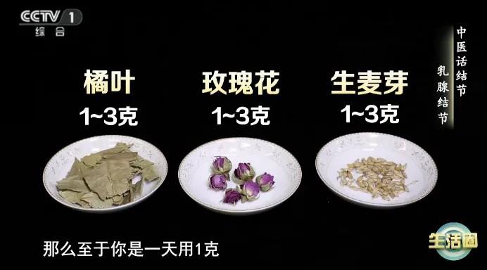 乳腺結節:橘葉、玫瑰花、生麥芽,各取1~3克,用熱水沖泡飲用。