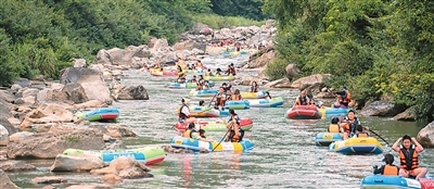 自助漂流是景區夏天最火爆的項目。杉木河44公里流程內落差高達640米。雖河水落差較大,但大部分河段水深只及大腿。一艘皮艇乘坐2人,漂流全程約2小時。