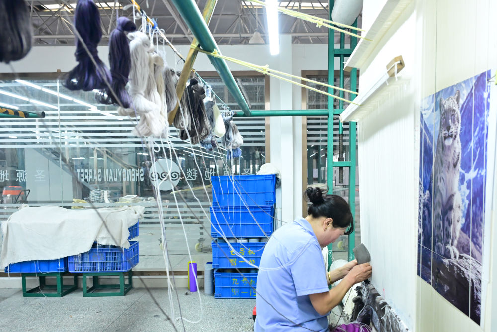 “在品牌創始與發展過程中,我們一直將藏毯作為企業發展的文化根脈,在此基礎上發展出手工編織、手工槍刺、機織三大工藝並行的生產體系,適應市場的同時,也守護住了藏毯傳統技藝。”聖源地毯副總經理杜非説,2007年建廠時,車間裏僅有十幾台織機。如今,企業已發展為佔地300餘畝的集團,近百台織機在車間裏運轉不息,自動化染紗生產線與研發檢測中心有序作業。
