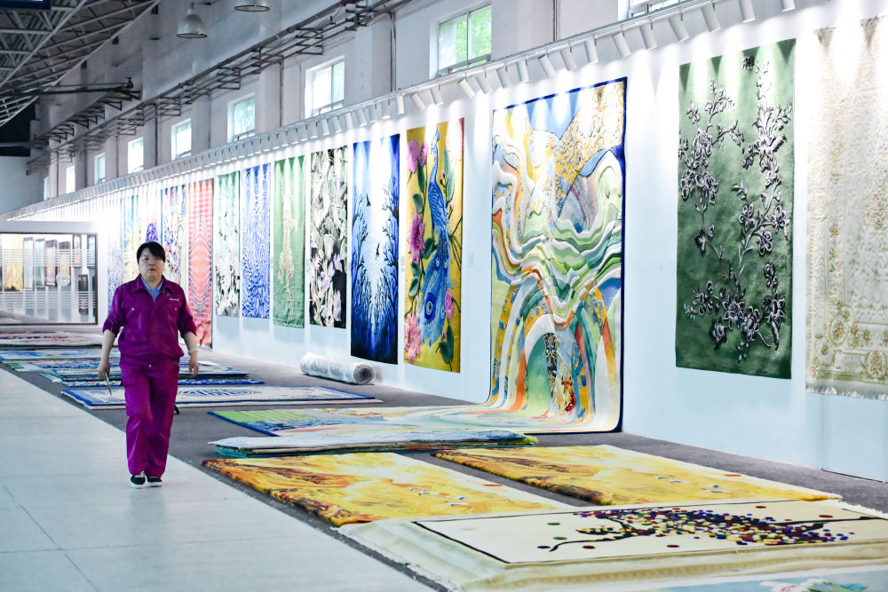 7月21日,聖源地毯集團有限公司車間內展示的各類掛毯。新華社記者 齊芷玥 攝