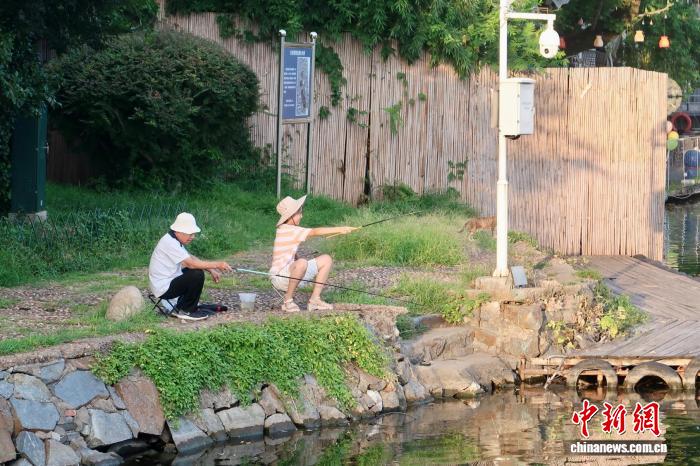 7月19日,江西省南昌市八一公園內,釣魚愛好者持小魚竿悠哉垂釣。朱瑩 攝