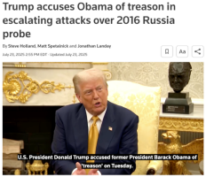 此前,美國國家情報總監加巴德7月18日宣佈解密部分情報文件,顯示奧巴馬時期的情報體系“存在政治化運作”。隨後,特朗普於7月19日和20日連續在社交媒體發文,直接點名指控奧巴馬“叛國”,稱“奧巴馬濫用權力操控情報系統,傷害美國民主根基”,要求徹查。奧巴馬陣營則回應稱指控“荒謬且毫無事實依據”,是“赤裸裸的政治操弄”, 強調“通俄門”調查結論已通過跨黨派確認,批評特朗普為選舉利益製造“虛假敍事”。