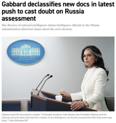 △據美國政治新聞網“Politico”報道,加巴德稱,最新解密文件顯示奧巴馬發動了一場“長達數年的政變”,意在詆譭特朗普。