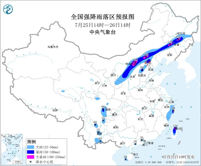 預計,7月25日14時至26日14時,內蒙古東南部和中部偏南地區、甘肅東北部、陝西北部、山西北部、河北西部和北部、北京北部和西南部、遼寧北部、吉林中部、黑龍江南部以及四川盆地西部、雲南中部、浙江東部、福建東北部、海南島西南部、台灣島中北部等地部分地區有大到暴雨,其中,內蒙古中部偏南地區、山西北部、河北北部、吉林北部和西南部、台灣島北部等地局地有大暴雨(100~160毫米)。上述部分地區伴有短時強降水(最大小時降雨量20~50毫米,局地可超過80毫米),局地有雷暴大風等強對流天氣。
