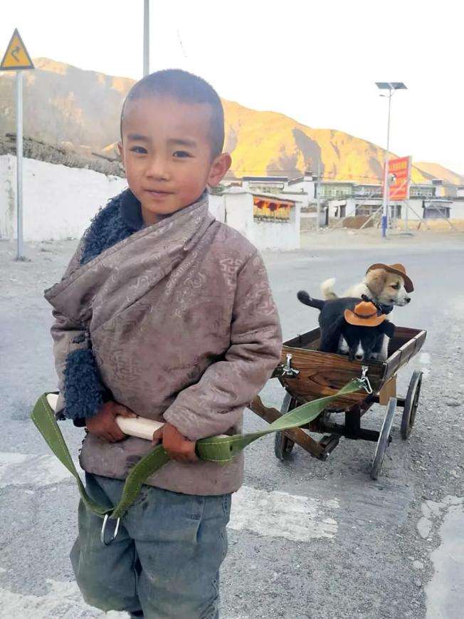 村子離珠峯僅有200多公里,年輕人大都外出工作了,只留下老人和小孩。沈輝成了“孩子王”,常常給孩子們分享平台上買的零食和水果。有一次,他還在拼多多上買了“小狗車”的裝置和零件。等組裝完成後,小孩都搶着當車伕,兩隻小狗在車裏開心地搖尾巴。