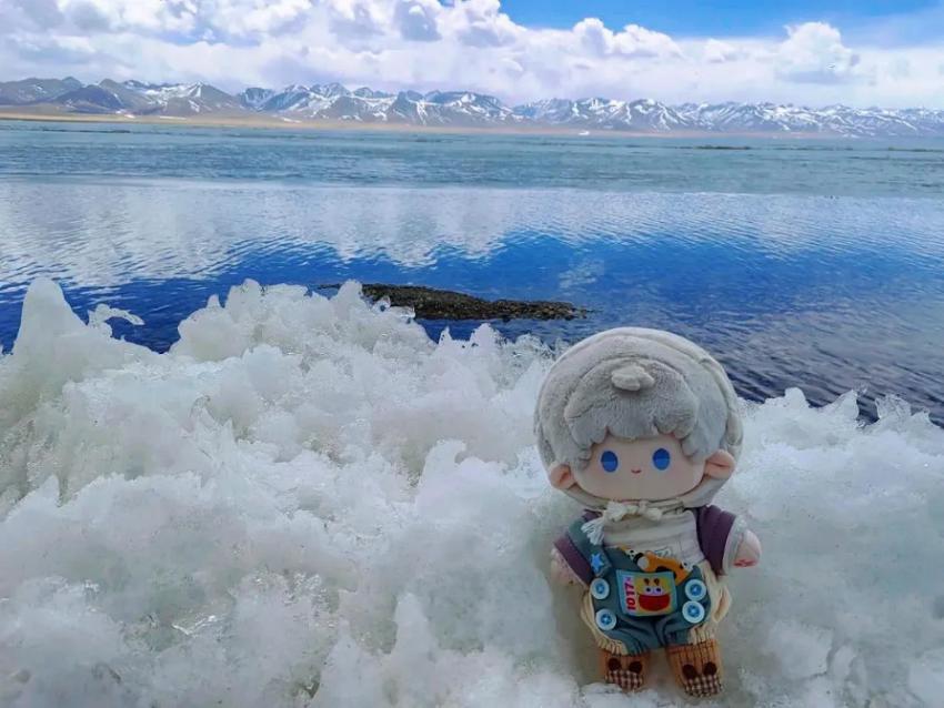 五一期間,她和家人一起去納木措旅遊,還帶上了沈星迴的玩偶。冰雪尚未消融,她以澄澈的湖水為背景拍下打卡照,恰好有一羣紅嘴鷗掠過。