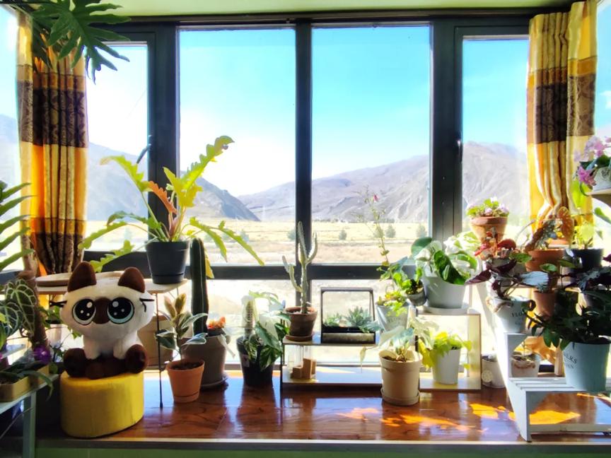 後來沈輝把家搬到了村子裏,房間的架子上擺滿了他心愛的綠植和玩偶。如果不是窗外的連綿羣山,根本看不出這是在西藏。沈輝説,這裏最美的季節就是夏季,山谷鋪滿黃色的油菜花,山坡上開出各色野花,厚厚的積雨雲擦着山間飄過,彷彿伸手就能摸到。