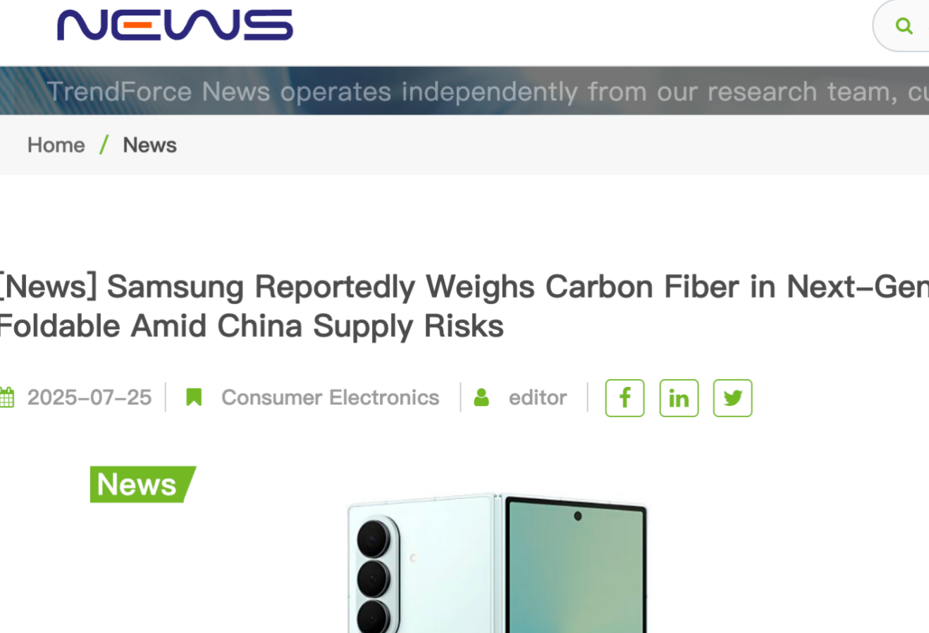 據介紹,現款 Galaxy Z Fold7 與限量款 Z Fold SE 均採用鈦合金背板,以實現更薄機身與更高剛性。然而三星目前鈦材高度依賴中國進口,若美國後續加徵關税,成本與交付週期均可能失控。為此,CFRP 重新進入候選名單。