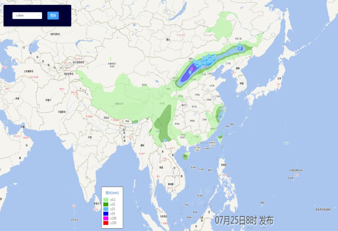 7月25日8時至26日8時,內蒙古中東部偏南地區、甘肅東部、陝西北部、山西北部、河北西部和北部、北京北部、遼寧西部、吉林中部、黑龍江東南部以及四川盆地西南部、雲南中部、浙江東部、台灣島等地部分地區有大到暴雨,其中,內蒙古中部偏南地區、山西北部、吉林中部偏北地區、黑龍江東南部、台灣島北部等地部分地區有大暴雨(100~150毫米)。
