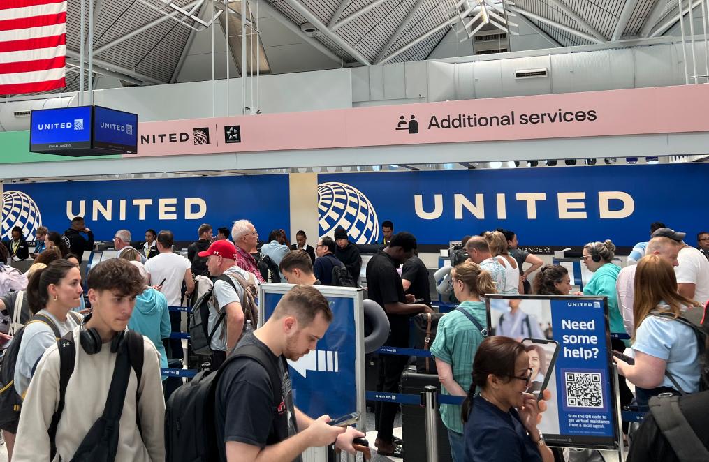 2024年7月19日,乘客在美國芝加哥國際機場等待航班信息。新華社記者顏亮攝