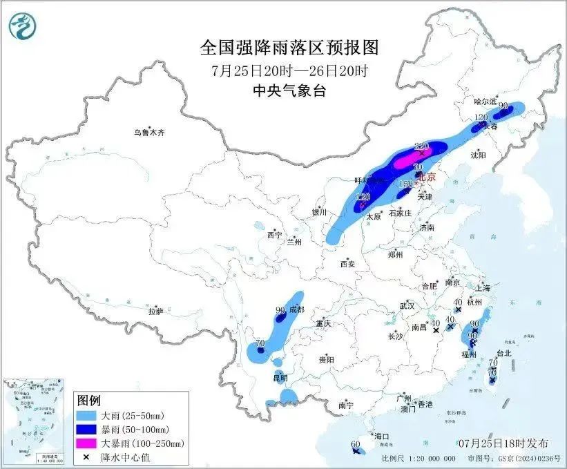 中央氣象台7月25日繼續發佈暴雨黃色預警和颱風藍色預警。今年第7號颱風“範斯高”將向浙江南部到福建北部一帶沿海靠近,強度逐漸減弱;第8號颱風“竹節草”將進入巴士海峽並趨向台灣以東洋麪,強度逐漸減弱。氣象部門預報,未來三天,華東地區有分散性陣雨或雷陣雨,其中沿海地區有分散性暴雨到大暴雨;西北地區東部、內蒙古中西部偏南地區、華北中北部、東北地區等地有持續性強降雨,西南地區有分散性強降雨,上述部分地區有大到暴雨,局地大暴雨;部分地區伴有短時強降水、雷雨大風或冰雹等強對流天氣。