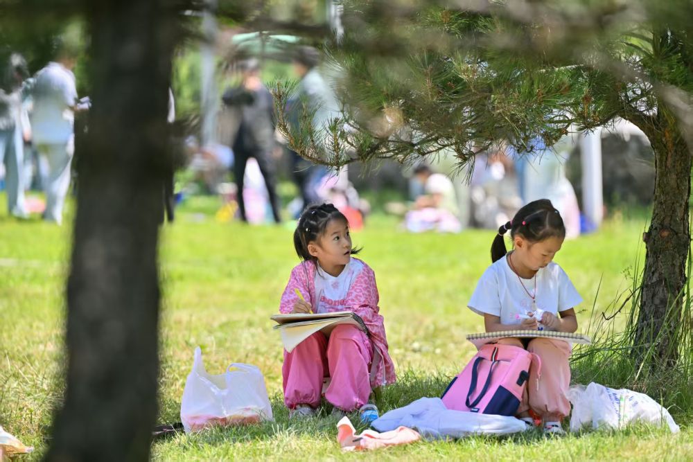 7月22日,兩名小學生在青海省大通縣邊麻溝花海景區內參加暑期美術寫生研學活動。新華社記者 孫瑞博 攝
