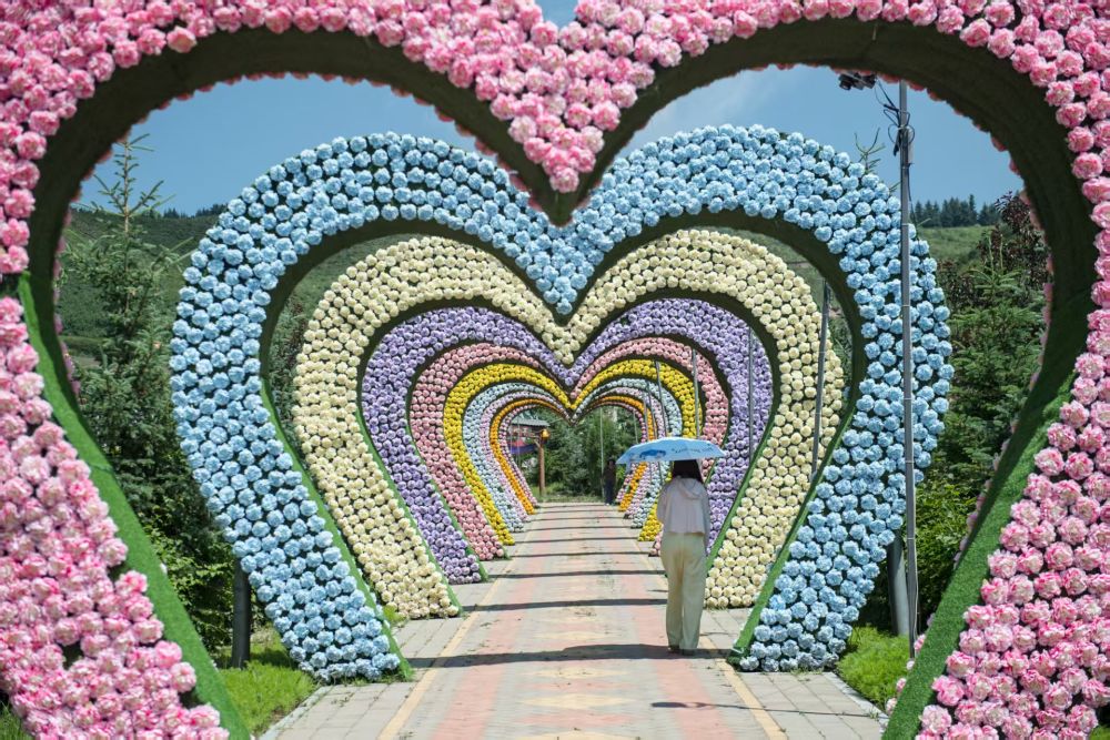 7月22日,在青海省大通縣邊麻溝花海景區,一名遊客經過鮮花長廊。新華社記者 孫瑞博 攝