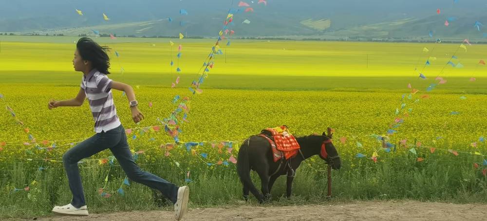 7月22日,抓拍到小遊客在門源百里油菜花旁奔跑。新華社記者 古一平 攝