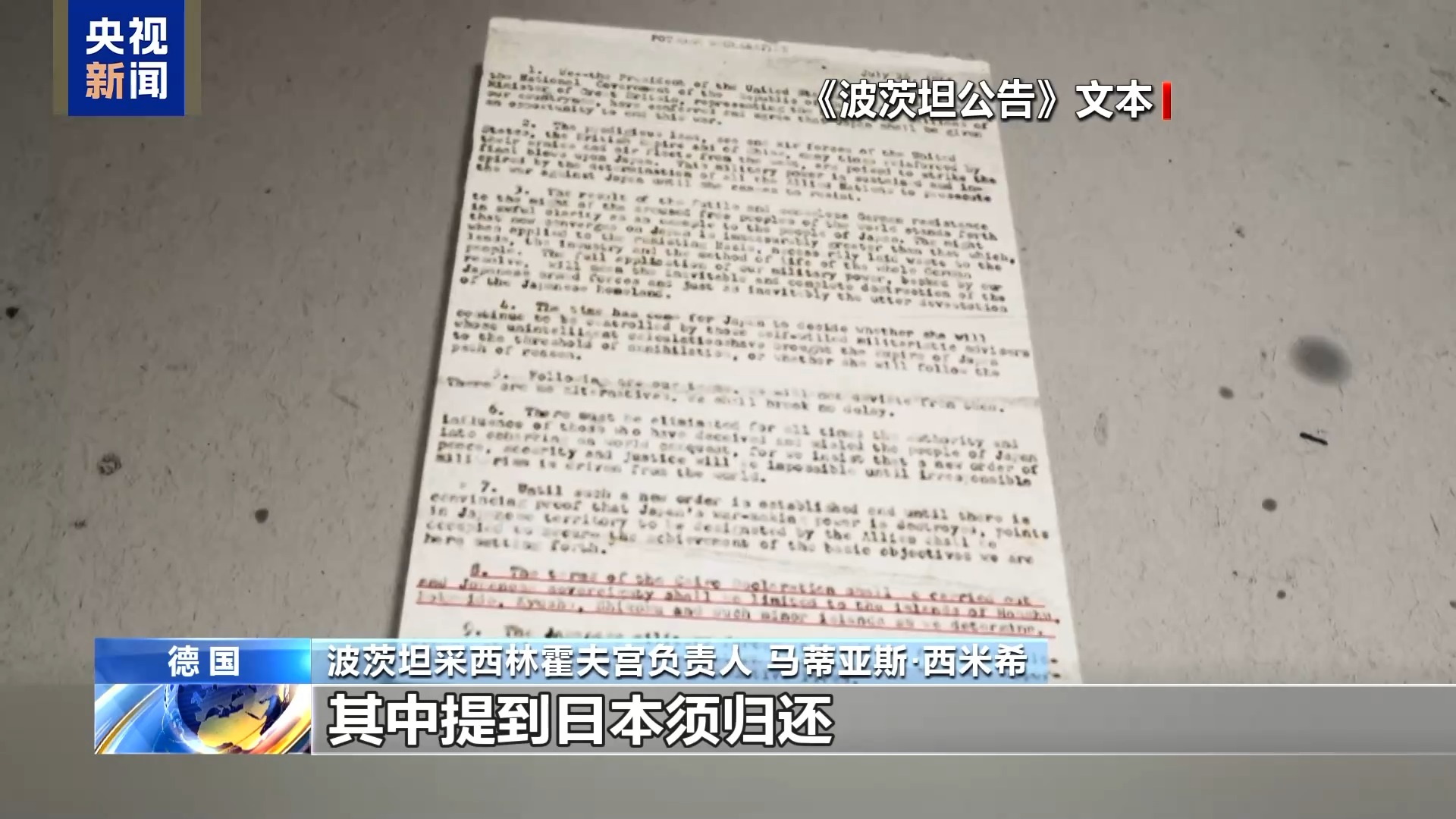 波茨坦採西林霍夫宮負責人 馬蒂亞斯·西米希:《波茨坦公告》中提到了《開羅宣言》,這是公告的第八條。《開羅宣言》於1943年發佈,其中提到日本須歸還其在二戰前或二戰期間佔領的所有領土。例如,台灣應歸還中國,日本代表在投降書中也接受了這些宣言。所以在我看來,這是具有約束力的。
