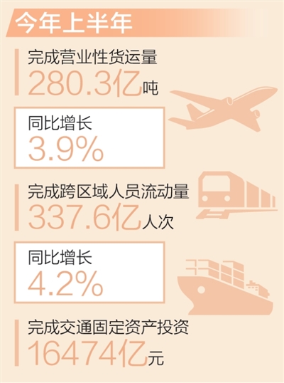 貨運量平穩增長。上半年,完成營業性貨運量280.3億噸,同比增長3.9%。分方式看,鐵路、公路、水路、民航貨運量同比分別增長1.8%、4.0%、4.3%和14.6%,其中,中國航運企業完成的遠洋貨運量同比增長9.4%。