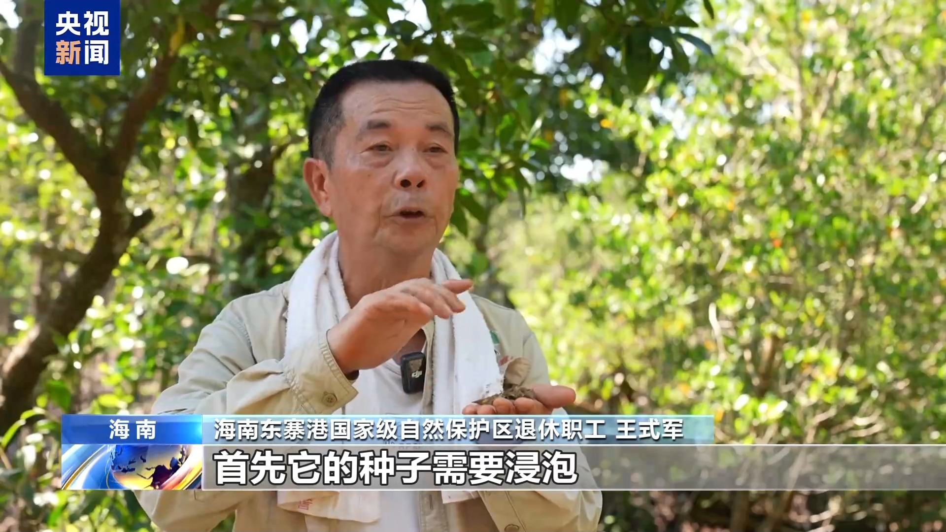 *海南東寨港國家級自然保護區退休職工 王式軍:*首先它的種子需要浸泡,浸泡的時間不好掌握,泡時間短了外殼打不開,泡時間長了又容易腐爛。由於經驗不足,第一批16株幼苗,先後15株都枯萎了,只有1株最後移植到野外存活了。