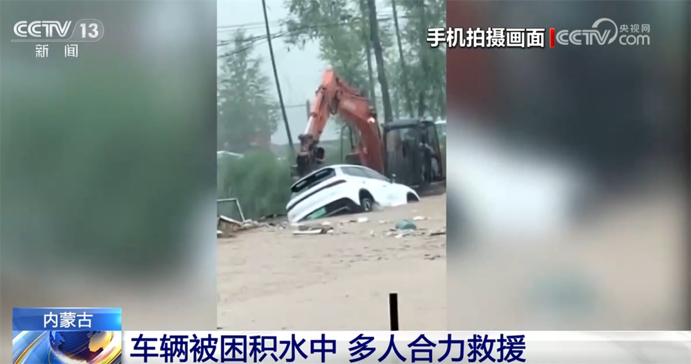 24日,受強降雨影響,內蒙古鄂爾多斯市準格爾旗興隆街道,一輛白色私家車試圖通過漫水橋時,被湍急的水流衝到橋邊,導致車輛側歪,司機被困。