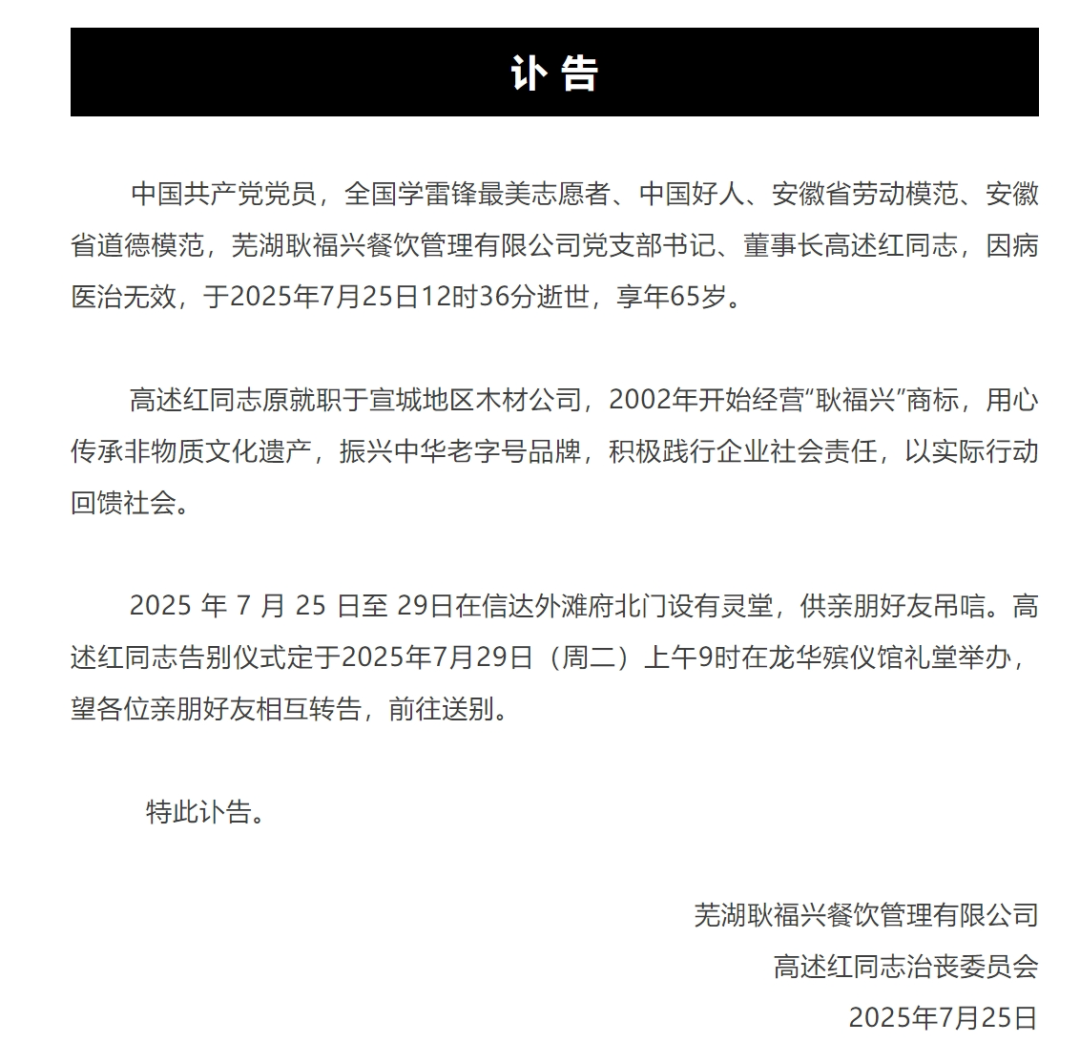7月26日上午,耿福興微信公眾號發佈訃告:中國共產黨黨員,全國學雷鋒最美志願者、中國好人、安徽省勞動模範、安徽省道德模範,蕪湖耿福興餐飲管理有限公司黨支部書記、董事長高述紅同志,因病醫治無效,於2025年7月25日12時36分逝世,享年65歲。