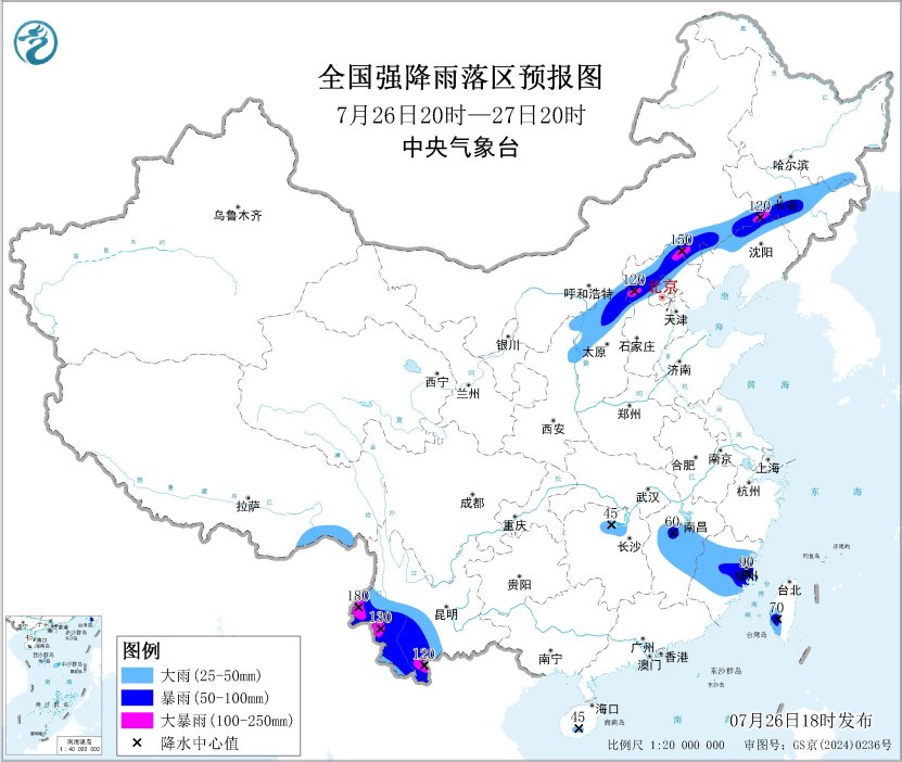 預計,7月26日20時至27日20時,內蒙古中東部偏南地區、陝西北部、山西北部、河北西部和北部、北京西部和北部山區、遼寧西北部、吉林中部、黑龍江東南部以及雲南西部和南部、江西中北部、湖南北部、福建中北部、海南島南部、台灣島南部等地的部分地區有大到暴雨,其中,內蒙古東南部偏南地區、河北北部、吉林中部偏南地區、遼寧北部、雲南南部和西部等地局地有大暴雨(100~180毫米)。上述部分地區伴有短時強降水(最大小時降雨量20~50毫米,局地可超過80毫米),局地有雷暴大風等強對流天氣。