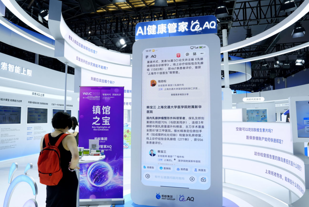 在WAIC的展區上,螞蟻集團集中展示了AI融入醫療、金融、生活場景的最新產品。其中,AI健康管家AQ成為焦點,入選了大會的最高獎項“SAIL獎”TOP30 和“鎮館之寶”兩項大獎。最新數據顯示,自去年9月在支付寶以小程序試運行、今年6月推出獨立App以來,AQ累計服務用户數已超1億。