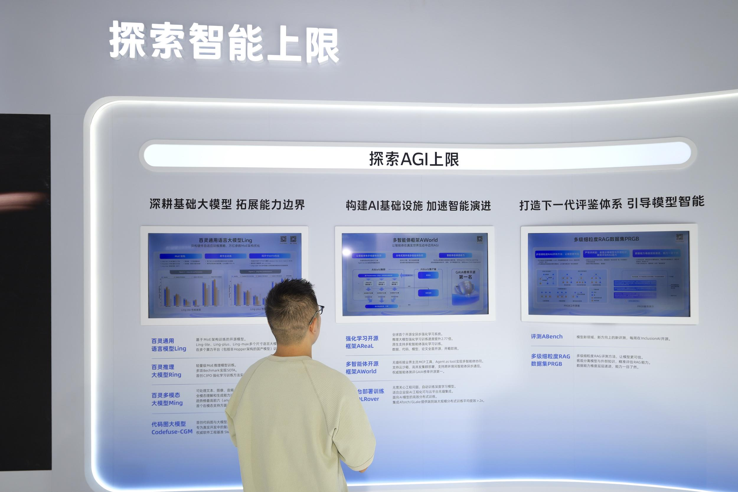 AI拓展普惠服務的邊界,但紮實的技術是根基。為了更具想象力的應用,螞蟻集團全力攻堅AGI,探索AI智能上限。記者在展區關注到,螞蟻集團全棧佈局AI,在AI Infra、大模型等層面都有不錯表現,並積極開源,對行業開放共建AGI能力。