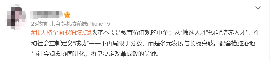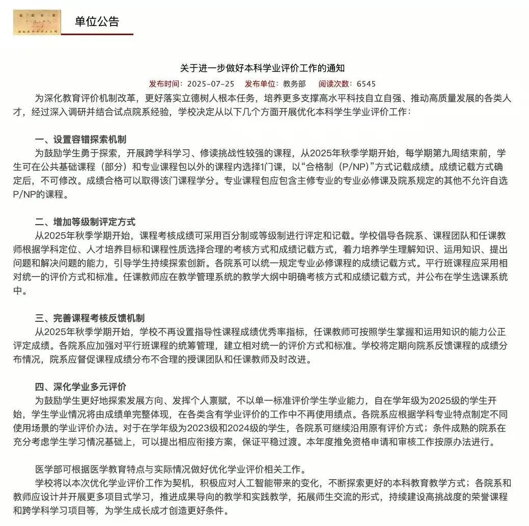 7月25日,北京大學在校內網發佈了《關於進一步做好本科學業評價工作的通知》,內容包括:從2025級學生起,在各類含有學業評價的工作中不再使用績點;課程考核成績可採用百分制或等級制進行評定和記載(等級製成績不換算成績點);不再設置指導性課程成績優秀率指標……