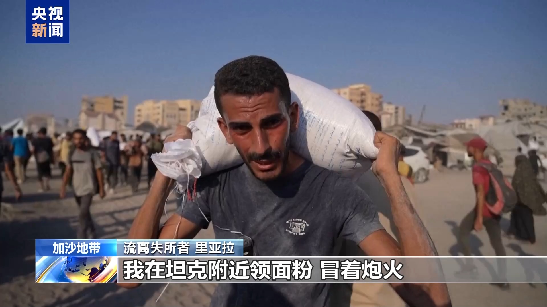 *流離失所者 里亞拉:*這是我26日的經歷,我在坦克附近領麪粉,冒着炮火,只是為了給我的孩子們領點糧食。我能説的就這些。