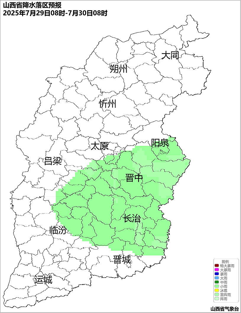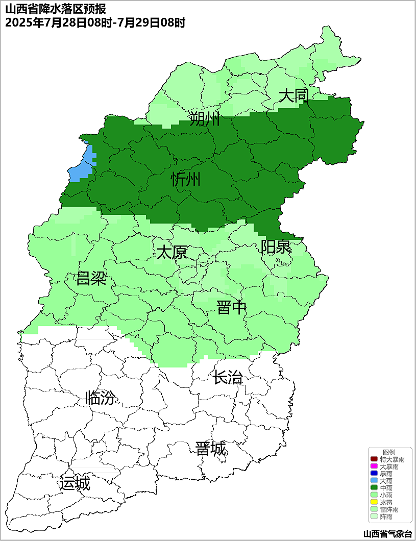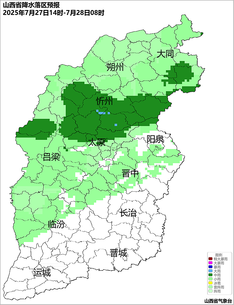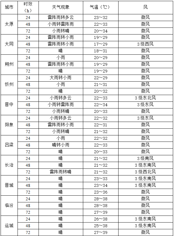 北中部陰天轉多雲,南部晴天間多雲,北中部大部和南部局部地區有陣雨或雷陣雨,北中部部分地區有中雨,大同南部、忻州、呂梁、太原、陽泉等地的局部地區有大到暴雨,並伴有短時強降水、雷暴大風等強對流天氣;中部局部和南部部分地區有35℃、南部局部有37℃或以上的高温天氣。