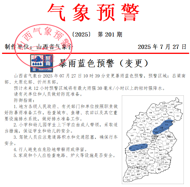 山西發佈暴雨藍色預警!北中部防範強降雨!