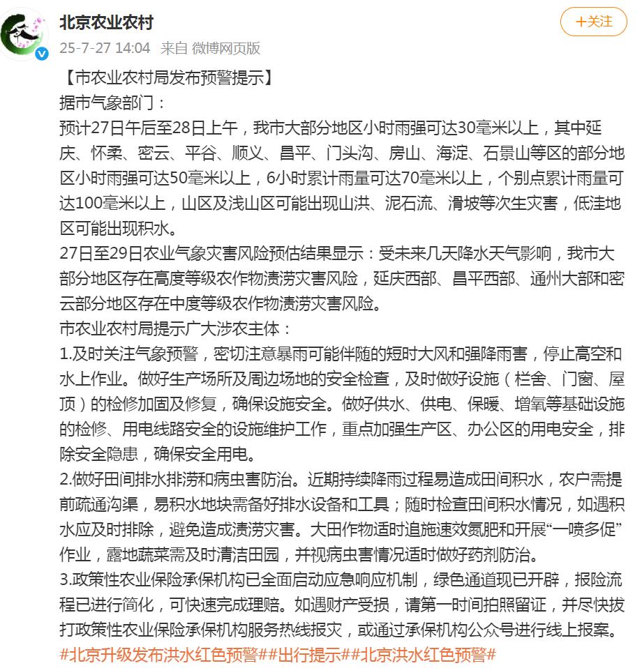 預計27日午後至28日上午,我市大部分地區小時雨強可達30毫米以上,其中延慶、懷柔、密雲、平谷、順義、昌平、門頭溝、房山、海淀、石景山等區的部分地區小時雨強可達50毫米以上,6小時累計雨量可達70毫米以上,個別點累計雨量可達100毫米以上,山區及淺山區可能出現山洪、泥石流、滑坡等次生災害,低窪地區可能出現積水。