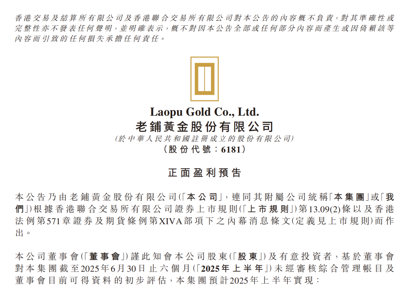 老鋪黃金髮布上半年盈喜公告 淨利潤或同比增長292%