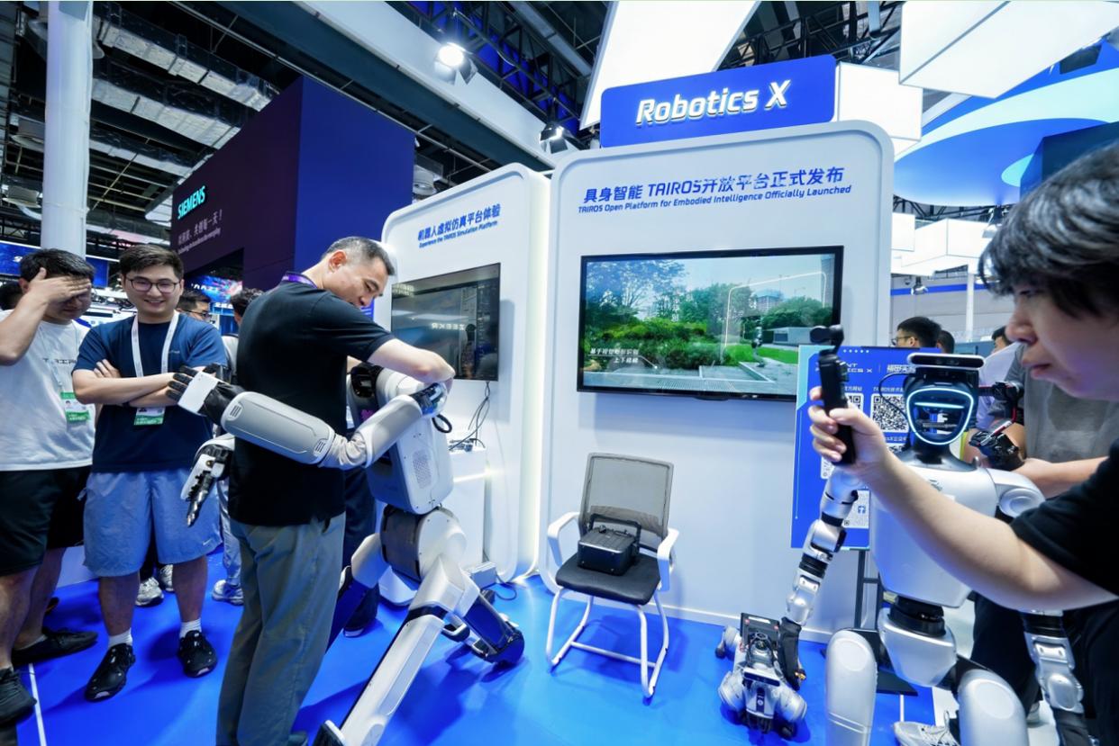 具身智能作為人工智能與機器人兩大前沿技術的結合,被視為新質生產力的重要組成部分。在騰訊展區,搭載了騰訊RoboticsX實驗室與福田實驗室聯合推出的具身智能開放平台Tairos的人居環境機器人“小五”、宇樹科技人形機器人G1與參觀者熱情互動。在應用集市展區,來自越疆的機械臂X-Trainer通過接入具身智能開放平台Tairos,實現“動動嘴就讓機器人給你做好飯”,讓機器人與人自然對話,理解人的意圖,感知環境狀態,拒絕不合理任務,並制定動作計劃,以響應需求。大會期間,騰訊旗下RoboticsX實驗室將發佈具身智能Tairos開放平台。
