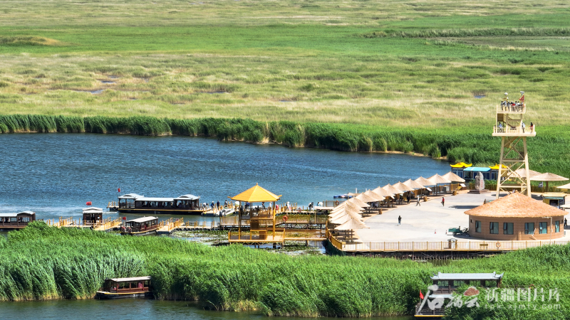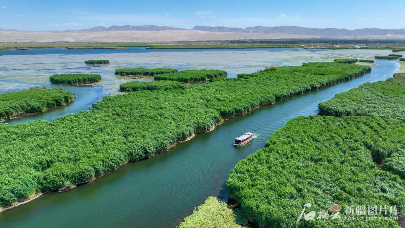 當天,博斯騰湖蓮海世界景區內碧波盪漾,萬畝睡蓮競相綻放,成片的蘆葦隨風搖曳,微風過處,綠浪翻湧,鷺鳥翩飛。朵朵綻放的睡蓮與碧藍的湖面、起伏的沙丘、連片的蘆葦交相輝映,遊客乘船盪漾其間,呈現出一幅“船在湖中行,人在畫中游”的生態畫卷。