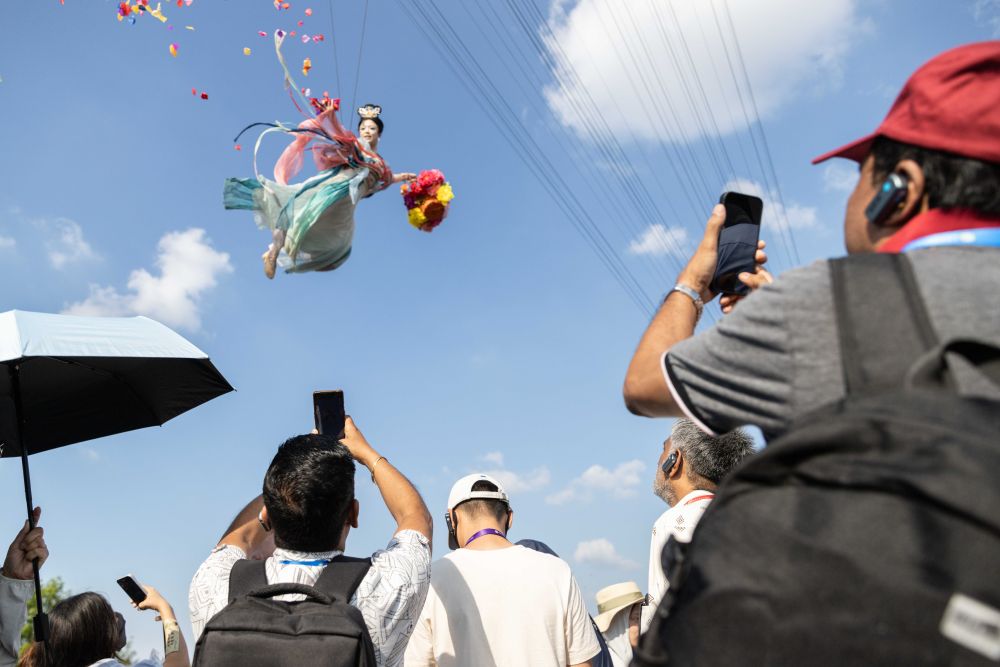 7月26日,上海合作組織媒體智庫峯會與會嘉賓在河南開封清明上河園拍攝“大宋飛天秀”。新華社記者 白雪騏 攝