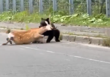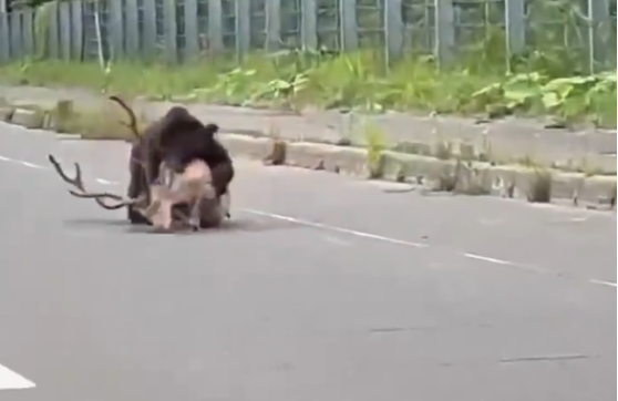 日本北海道一頭熊在國道上襲擊一隻鹿並將其拖入草叢,視頻在網上熱傳