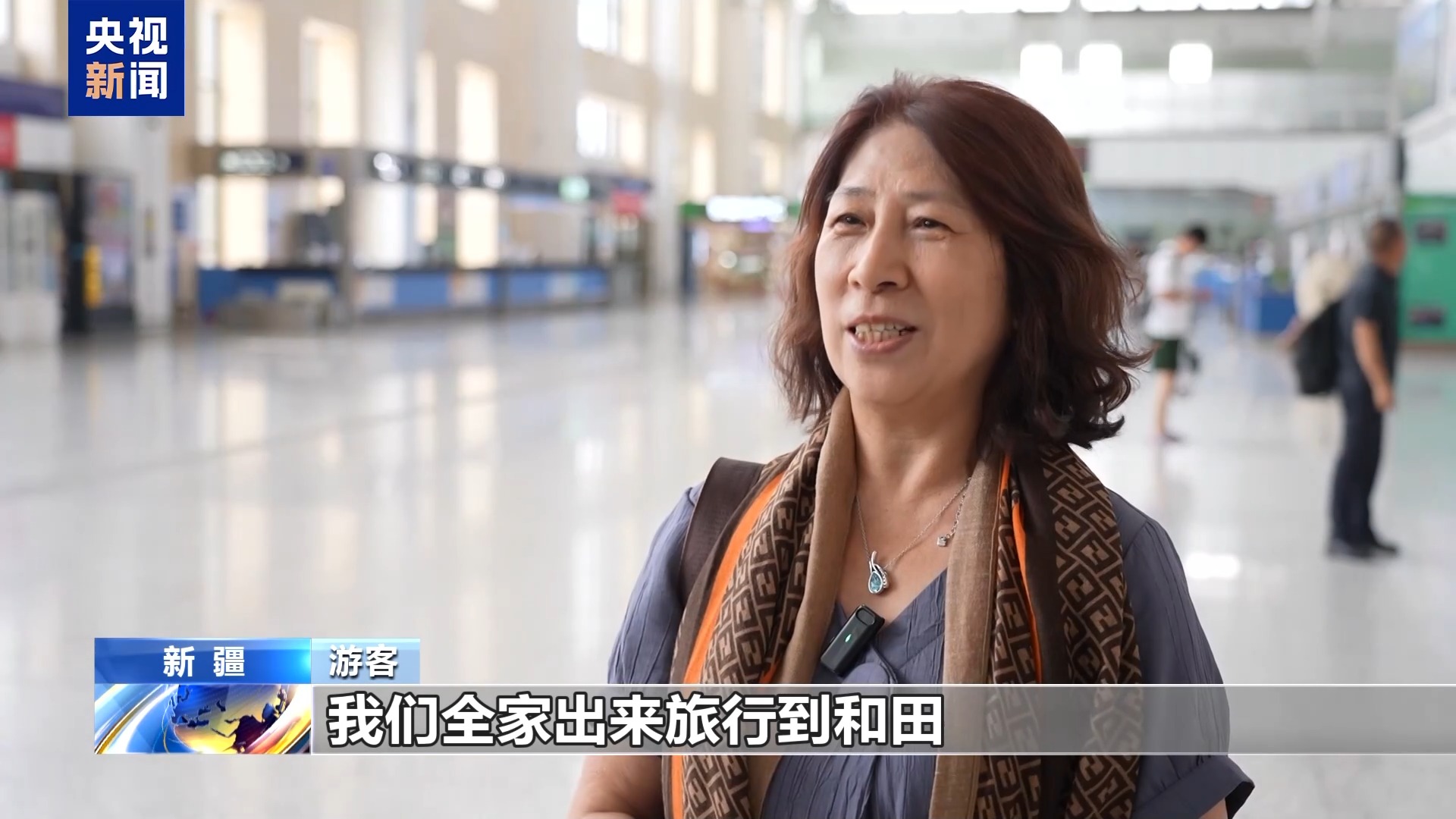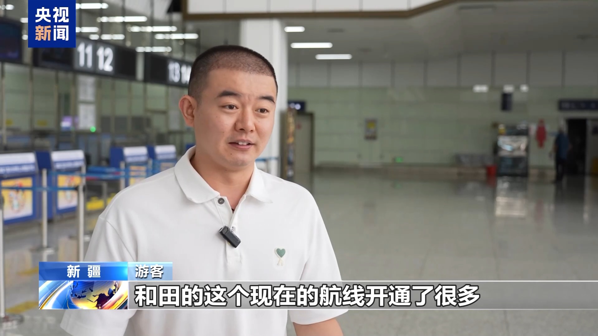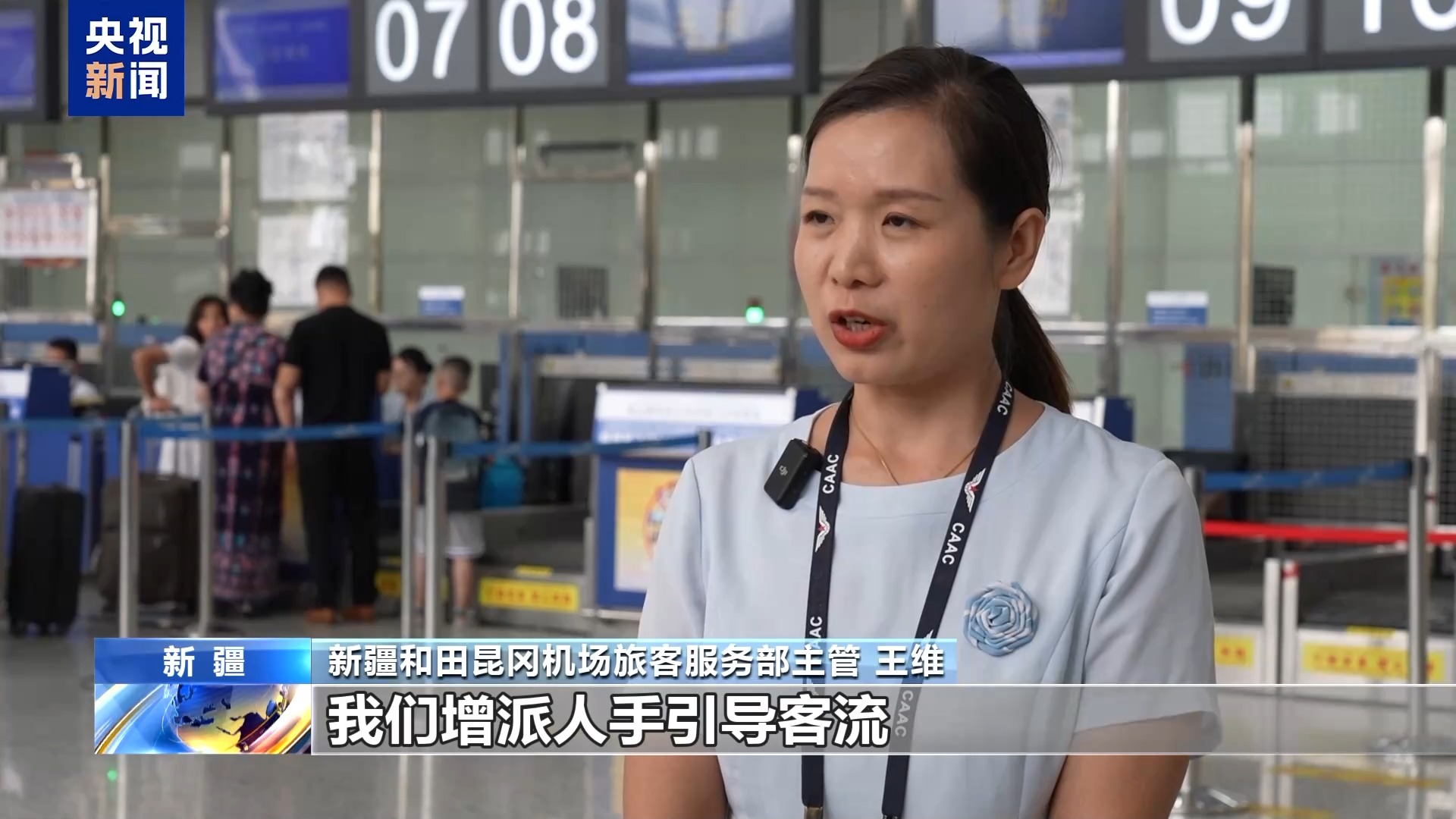 *新疆和田昆岡機場旅客服務部主管 王維:*今年旅客量增長特別明顯。我們增派人手引導客流、優化值機流程,還加開了安檢通道,就是為了讓旅客走得快、走得舒心。