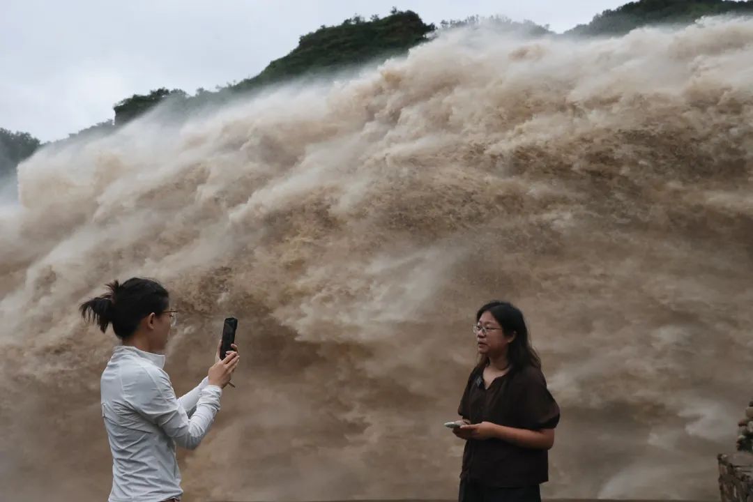 黃松峪水庫的溢流口,庫水奔湧而出,激起了濃密的水霧。昨夜,平谷區最大降雨站點位於水庫上游的黃松峪鄉梨樹溝,達到了約230毫米。因此從凌晨的2時到5時,水務部門一直在根據來水量調整泄水作業。