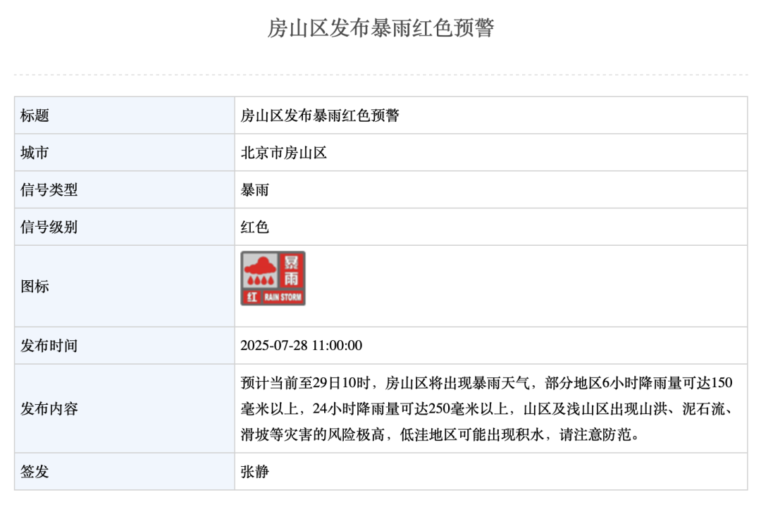 據北京市氣象台消息,7月28日11時,房山區發佈暴雨紅色預警: 預計當前至29日10時,房山區將出現暴雨天氣,部分地區6小時降雨量可達150毫米以上,24小時降雨量可達250毫米以上,山區及淺山區出現山洪、泥石流、滑坡等災害的風險極高,低窪地區可能出現積水,請注意防範。