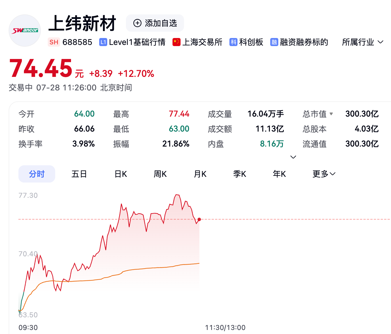 【環球網財經綜合報道】7月28日,上緯新材股價震盪上揚,盤中再度刷新歷史新高。股價最高漲至77元/股,年內累計漲幅超10倍,成為A股2025年以來首隻漲幅達10倍的個股。