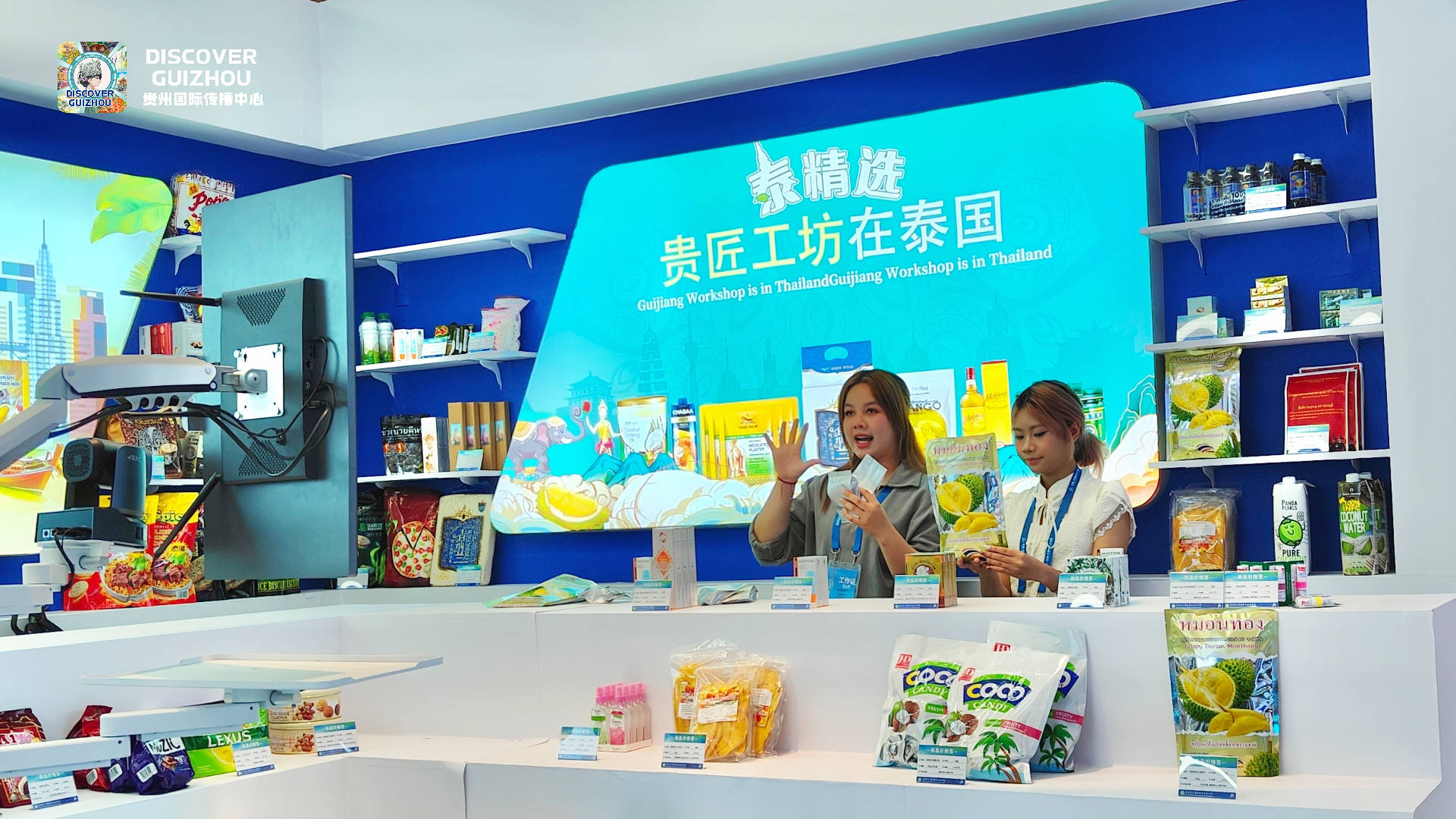 交流周現場,貴州電子商務職業技術學院“貴匠工坊”展位上,來自泰國博仁大學經貿中文系的學生肖夢心和張娜玲正“變身”主播,熱情洋溢地向觀眾推薦泰國特色產品。
