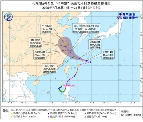 中央氣象台預計,“竹節草”將以每小時15~20公里的速度向西偏北方向移動,將於29日下午到夜間在浙江北部到江蘇南部一帶沿海登陸(23~28米/秒,9~10級,熱帶風暴級或強熱帶風暴級),登陸後強度緩慢減弱。