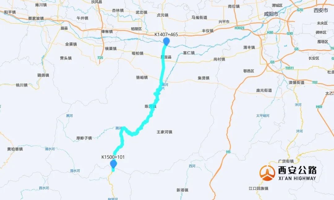 108國道K1407+465-K1412+500(周至縣與武功縣交界處-周至縣環城北路)、K1415+000-K1424+400(周至縣環城南路-周至縣馬召鎮)、K1424+400-K1471+020(山區段)、K1498+780-K1501+750(山區段)。