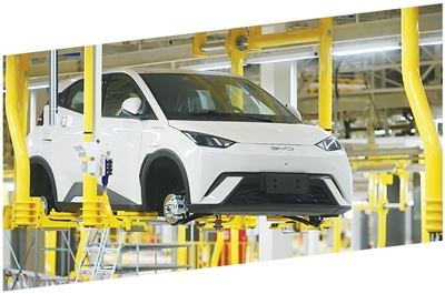 巴西巴伊亞州卡馬薩里市的比亞迪工廠,一輛新能源汽車正在組裝中。