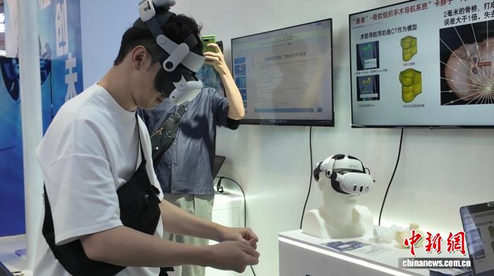 從創意生成到落地應用,人工智能領域不乏兩岸攜手的身影。走進艾生智慧(北京)醫療科技有限公司的展示區,觀眾戴上AR眼鏡,瞬間從現實世界切換至虛擬手術枱。試着在工具台上抓握手術刀,化身一位骨科醫生。該眼鏡搭載精準導航技術,應用在骨科手術領域,可有效減少誤差。
