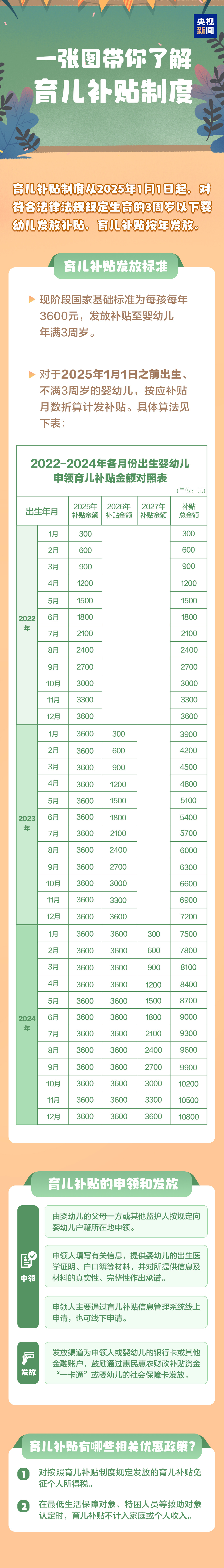 《實施方案》明確了補貼對象和標準,育兒補貼制度從2025年1月1日起,對符合法律法規規定生育的3週歲以下嬰幼兒發放補貼,育兒補貼按年發放,現階段國家基礎標準為每孩每年3600元,發放補貼至嬰幼兒年滿3週歲。